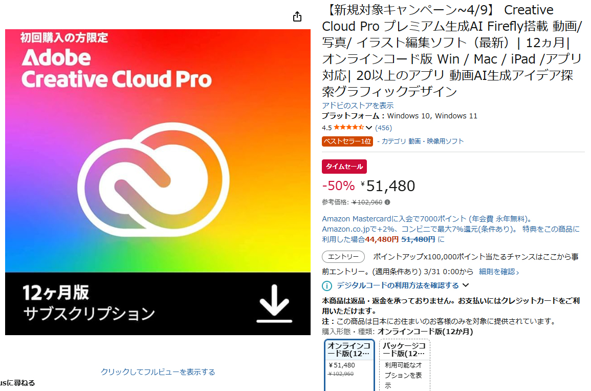 Amazonはよくキャンペーンが行われていて、キャンペーン時には「Adobe CC pro」がかなり安くなります!恐らく最安!