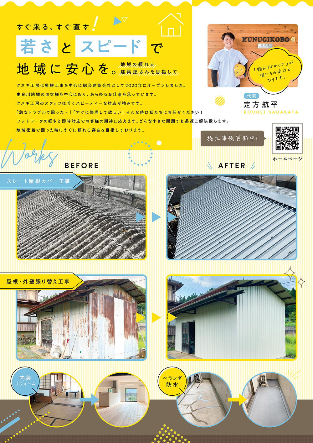 2025.07.08 チラシ・ポスター チラシ制作【クヌギ工房様(京都府福知山市)】 cotonoha-design Client:クヌギ工房様 Category:チラシ Service:構成 / デザイン(A4両面) Area:京都府福知山市 ABOUT ME コトノハデザイン 岡本 佳菜子フリーランスWebデザイナーInstagram京都府福知山市を拠点に活動するフリーランスWebデザイナー。 制作会社で10年間Webデザイナーとして勤務し 2020年にフリーランスとして独立。