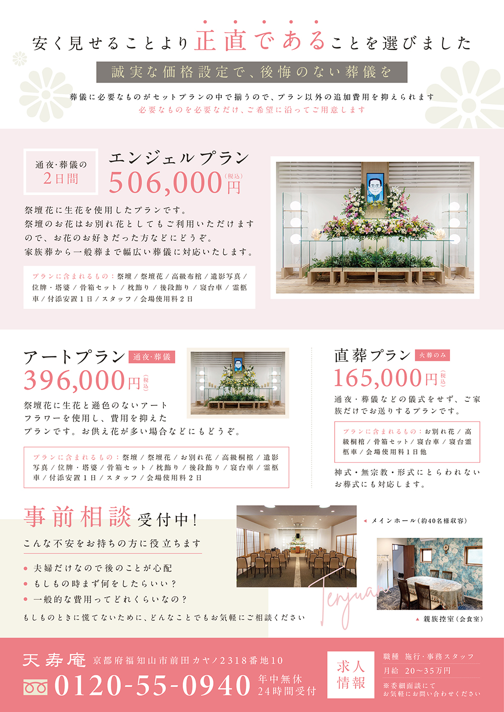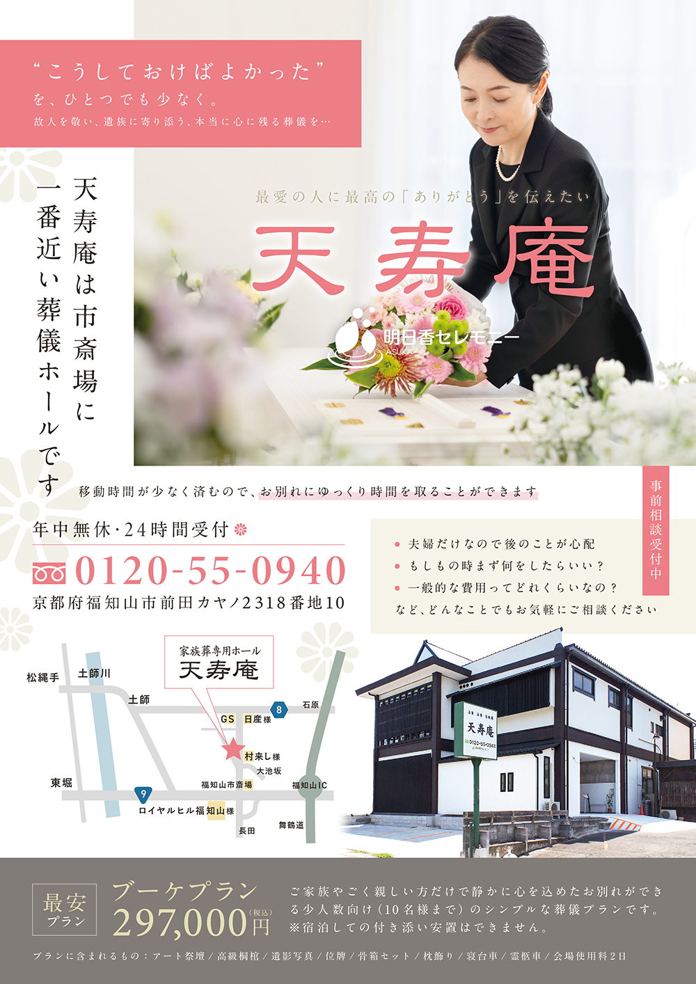 2025.11.29 チラシ チラシ制作【明日香セレモニー天寿庵様(京都府福知山市)】 cotonoha-design Client:明日香セレモニー天寿庵様 Category:チラシ Service:構成 / デザイン(A4両面) Area:京都府福知山市 ABOUT ME コトノハデザイン 岡本 佳菜子フリーランスWebデザイナーInstagram京都府福知山市を拠点に活動するフリーランスWebデザイナー。 制作会社で10年間Webデザイナーとして勤務し 2020年にフリーランスとして独立。